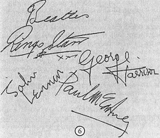 7. This album page was signed after a performance in Croydon, Surrey on April 25, 1963. John's signature is coming along in the evolutionary process. It is interesting to see he has signed twice. Note some of the differences between the two signatures. George is now beginning to round off his "G". Although not quite keeping pace with John and George, Paul started to connect the "M" to the double "C" and Ringo began to underscore his signature (after drawing a star), in one continuous stoke, first to the left towards the "i", then back to the right towards the double "r". Previously he underlined his signature with two separate lines.