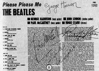 8. This Please Please Me LP was signed in mid-June 1963, while The Beatles were in Salisbury. Paul was experimenting at this time with an elongated "P" which descended quite a bit below the plane of his signature. Also, in this example, his "l" is flat with no loop. All four of these signatures are great examples from this time period and are all extremely large in size, with the McCartney signature measuring five inches across.