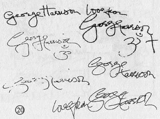 20. Harrison's signature has certainly come a long way since the early days. Throughout his solo career, his signature has become tighter and more curvilinear. Left, top to bottom: examples from 1971, 1974 and 1980. Note the Sanskrit symbol on the 1974 example. Right, top to bottom: 1981 (Sanskrit symbol again), 1988 and 1990.