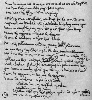 28. This is a gem - the first two-thirds of I Am the Walrus in Lennon's hand. This is a rewrite, more than likely for studio purposes, with only a couple of corrections. A complete key Lennon composition in his hand could sell for up to $150,000, which puts him in a class with Bach and Schubert.