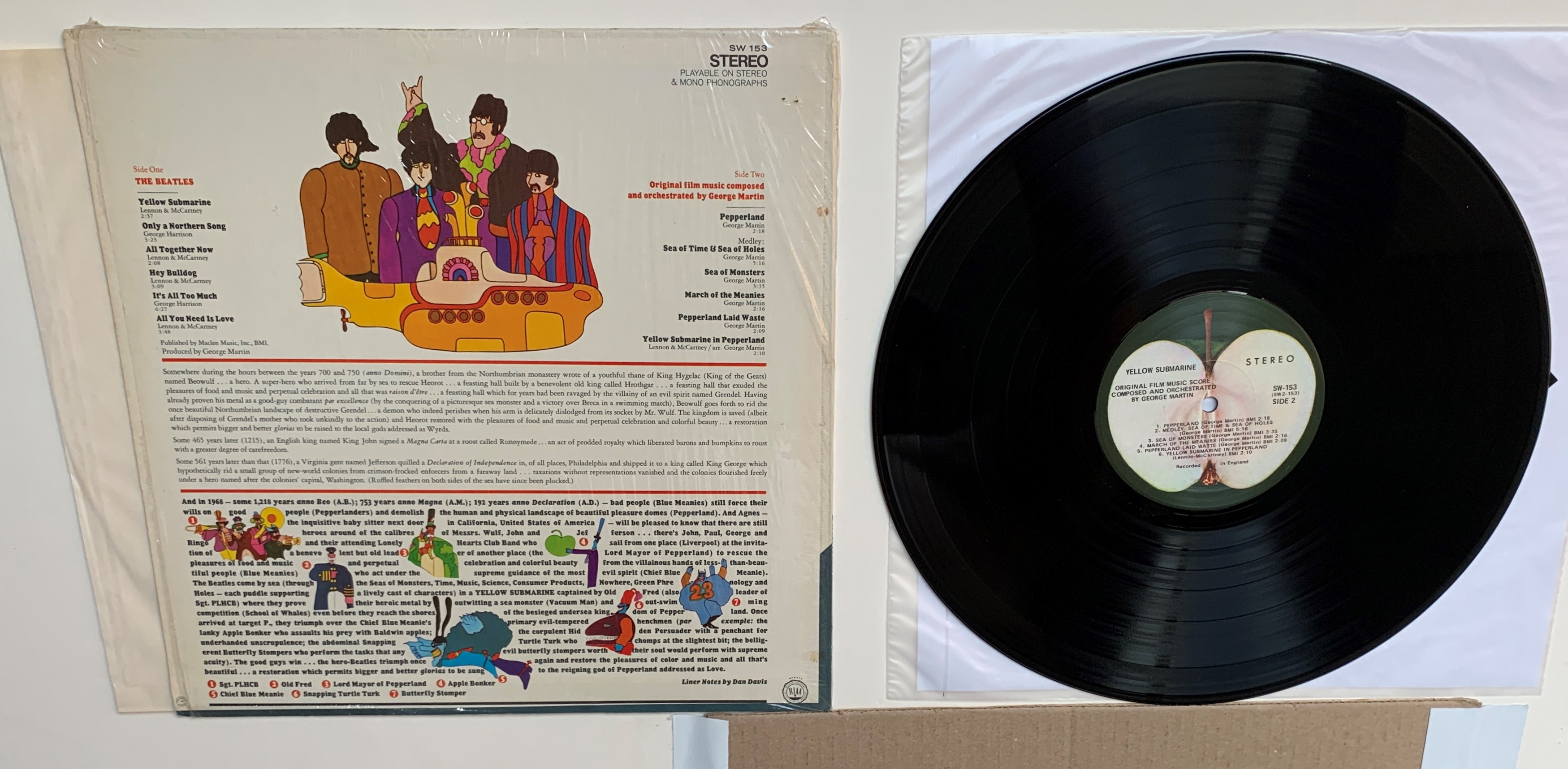 Jacket = NM- in Shrinkwrap Vinyl = NM / NM / NM- / NM Poster = NM 4 Photos = NM 2 Inner sleeves = EX16. THE BEATLES YELLOW SUBMARINE - APPLE RECORDS # SW-153 in SHRINKWRAP.